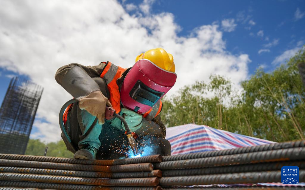 工人在薩熱路跨江大橋建設(shè)現(xiàn)場(chǎng)焊接鋼筋(6月18日攝)。