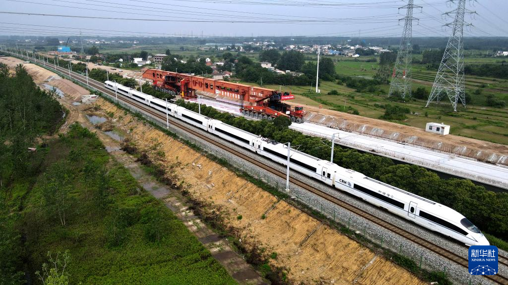 新建滬寧合高鐵安徽段站前四標(biāo)最后一榀40米箱梁完成架設(shè)(6月25日攝,無(wú)人機(jī)照片)。