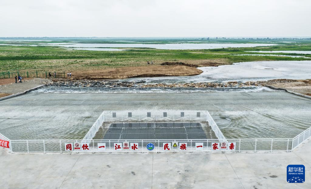 6月30日拍攝的引綽濟遼工程通遼市莫力廟水庫出水口(無人機照片)。