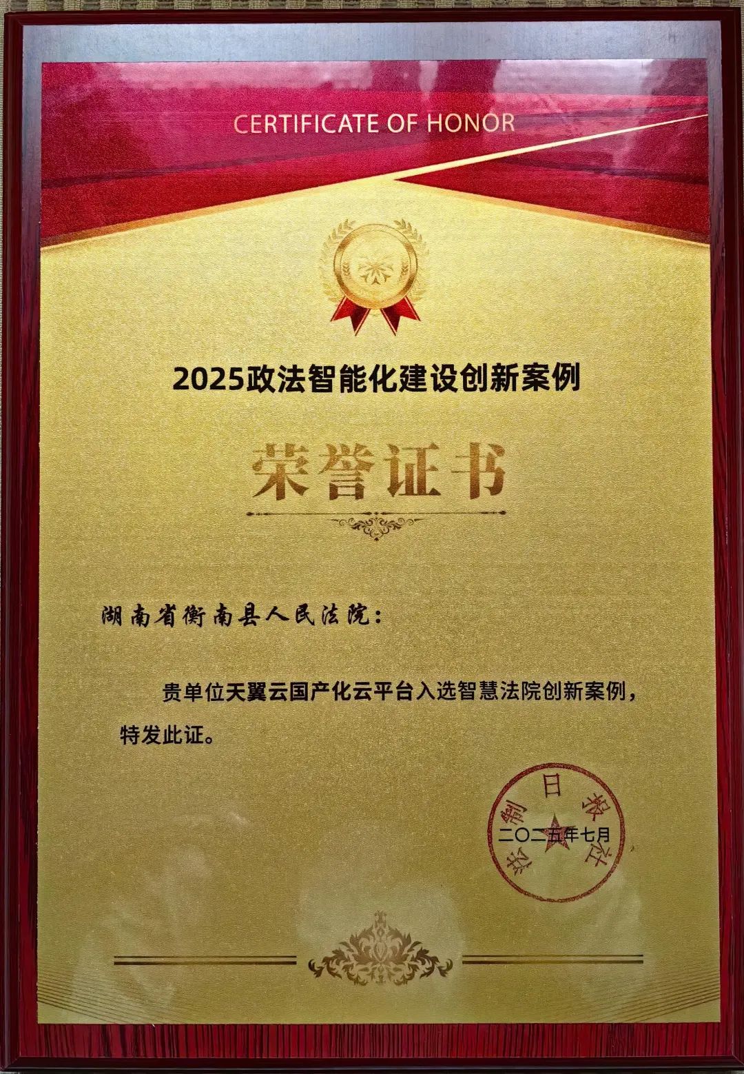 近日,由法制日報主辦的2025年政法智能化建設(shè)技術(shù)裝備及成果展在北京國家會議中心舉行,最高人民法院司法行政裝備管理局一級巡視員皮侃鄭為智慧法院創(chuàng)新案例獲獎單位頒發(fā)證書。衡南縣人民法院案例《天翼云國產(chǎn)化云平臺》作為湖南省法院系統(tǒng)唯一獲獎案例成功入選。