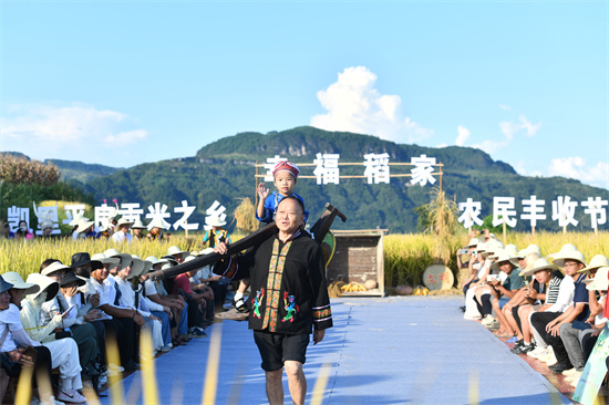 2025年8月28日,貴州省黔東南苗族侗族自治州凱里市2025年凱里平良貢米豐收節(jié)舉行。當(dāng)天,在該市大風(fēng)洞鎮(zhèn)都蓬村的稻田中央搭建T臺(tái),邀請貴州村T及當(dāng)?shù)毓脣寕兩涎菝褡鍟r(shí)裝秀與農(nóng)特產(chǎn)品結(jié)合,創(chuàng)新推進(jìn)“農(nóng)文旅”深度融合發(fā)展,為鄉(xiāng)村振興注入新動(dòng)能。