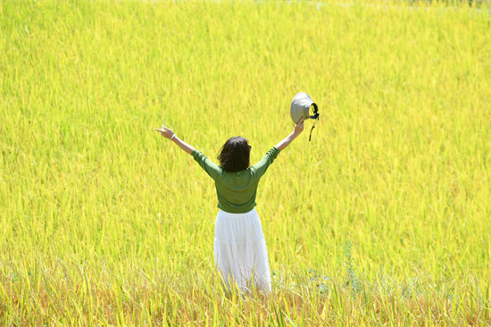 8月28日,貴州省凱里市大風(fēng)洞鎮(zhèn)都蓬村,一游客在感受水稻豐收的喜悅。(楊仁海 攝)
