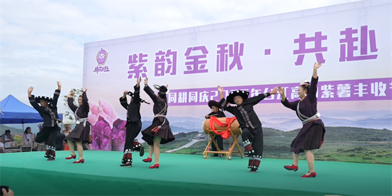 豐收節(jié)現(xiàn)場(chǎng),氛圍熱烈而喜慶。憨態(tài)可掬的“紫薯寶寶”人偶迎賓、熱情洋溢的苗族攔門酒儀式,迅速拉近了游客與苗鄉(xiāng)的距離。粗獷豪放的《反排木鼓舞》跳出了豐收的喜悅,悠揚(yáng)的歌聲傳遞著貴州的熱情。挖紫薯比賽環(huán)節(jié)更是將活動(dòng)推向高潮,參賽者們體驗(yàn)著田園勞作的樂趣,感受著收獲的滿足。