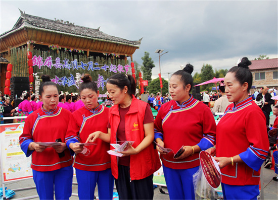 9月民俗節(jié)日密集,成為普法重要窗口。9月11日,平秋鎮(zhèn)高壩村“七月二十趕歌節(jié)”舉辦,侗族同胞身著盛裝歡聚,游客慕名而來??h委政法委、縣司法局聯(lián)動當(dāng)?shù)夭块T,推出“民俗+法治”模式:工作人員圍繞《民法典》《未成年人保護法》《反有組織犯罪法》,通過“發(fā)物資+講案例”普法——發(fā)放法律手冊及印普法知識的扇子、圍腰,用漢語+侗語“雙語”講解婚姻家庭、鄰里矛盾案例,打破語言與認知壁壘,讓法治精神隨歌聲傳遞。