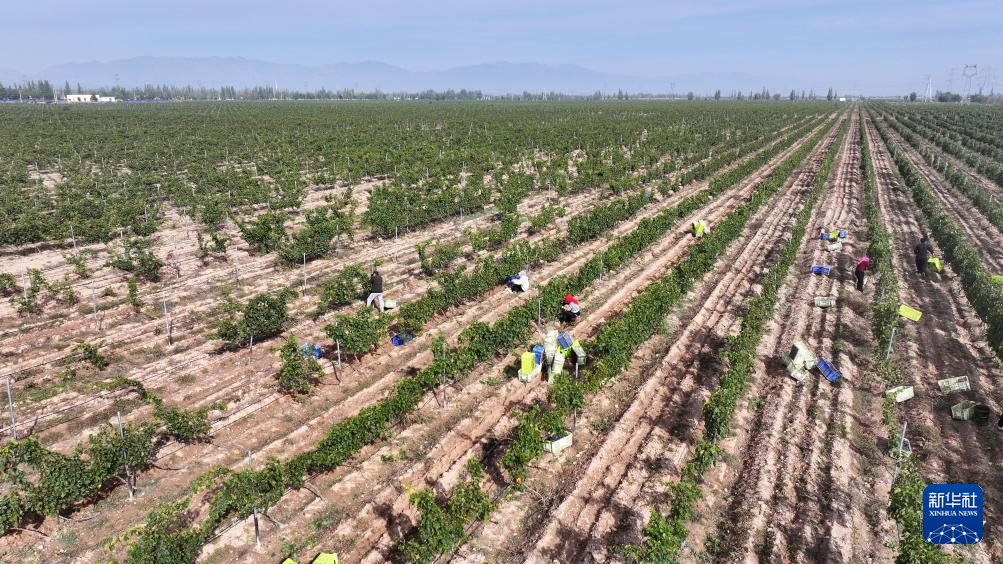 農(nóng)戶在銀川市永寧縣閩寧鎮(zhèn)葡萄地里采摘釀酒葡萄(無人機(jī)照片,10月14日攝)。