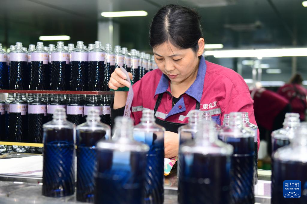 11月27日,在鄆城縣丁里長街道煙鄆科技產(chǎn)業(yè)園,工作人員為酒瓶貼花。