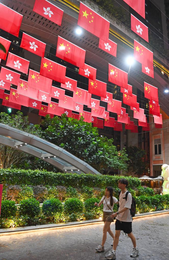 7月1日,行人從懸掛著五星紅旗與特區(qū)區(qū)旗的香港利東街走過(guò)。新華社記者 陳鐸 攝
