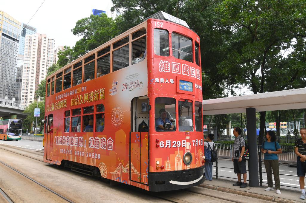 7月1日,一輛涂裝慶祝香港回歸祖國(guó)28周年海報(bào)的電車從香港街頭駛過(guò)。新華社記者 陳鐸 攝