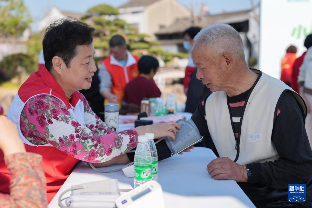 3月2日,志愿者在寧波市奉化區(qū)蕭王廟街道青云村為村民測量血壓。