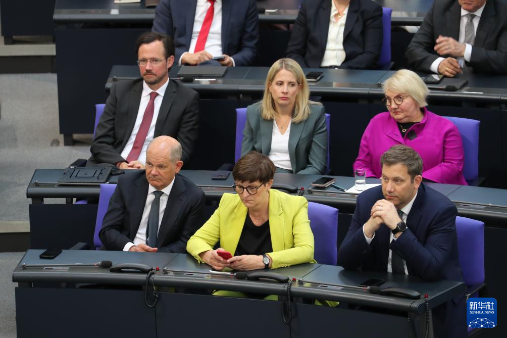 5月6日,在德國(guó)首都柏林的國(guó)會(huì)大廈,即將卸任的德國(guó)總理朔爾茨(前排左一)在第二輪投票議程中。