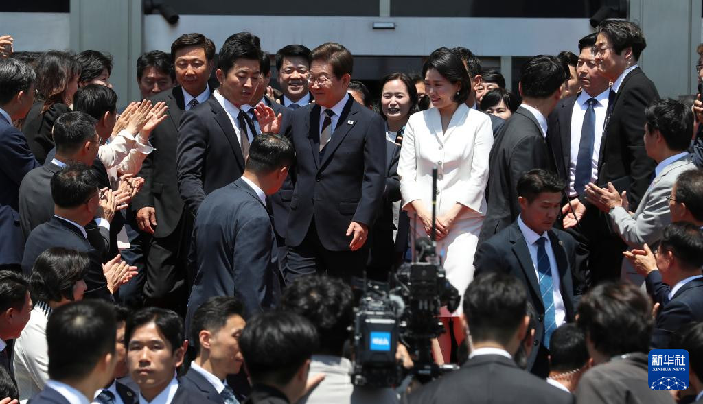 6月4日,在韓國首爾,李在明(中左)和夫人在韓國國會(huì)向支持者表示感謝。