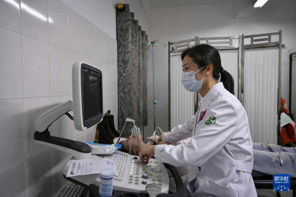 4月29日,在位于幾內(nèi)亞首都科納克里的中幾友好醫(yī)院,中國(guó)醫(yī)療隊(duì)醫(yī)生趙晶為患者做超聲檢查。