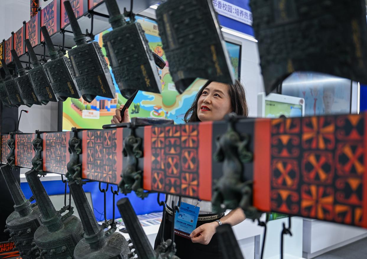 5月14日,在2025世界數(shù)字教育大會教育數(shù)字化成果展上,參觀者體驗編鐘演奏。新華社記者 杜子璇 攝
