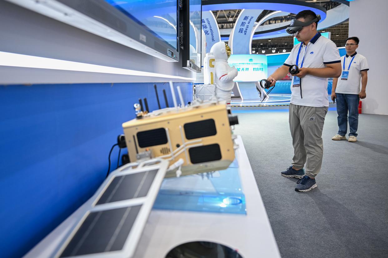 5月14日,在2025世界數(shù)字教育大會教育數(shù)字化成果展上,參觀者體驗衛(wèi)星仿真教學(xué)系統(tǒng)。新華社記者 杜子璇 攝