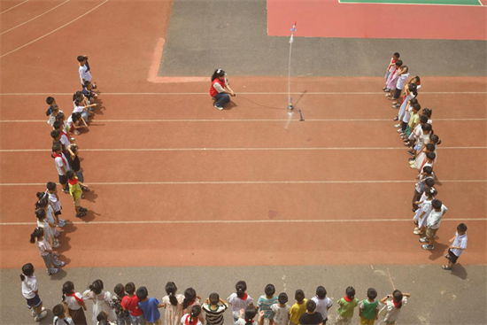 教室外,同學(xué)們齊聚運(yùn)動(dòng)場(chǎng)、圍繞成圈,在志愿者組織下共同開展“水火箭”科普實(shí)驗(yàn)。志愿者拆解實(shí)驗(yàn)裝置,為同學(xué)們具體講解“水火箭”組成部件及對(duì)應(yīng)功能。現(xiàn)場(chǎng)同學(xué)們熱情高漲、熱烈互動(dòng),積極參與到“水火箭”的注水、加壓、發(fā)射環(huán)節(jié),共同見證“火箭”升空騰飛、徐徐降落。“通過親自操作‘水火箭’,我認(rèn)識(shí)到了科學(xué)研究的不易和科研精神之美,我將加強(qiáng)學(xué)習(xí)、提升知識(shí)素養(yǎng),努力成為知識(shí)扎實(shí)、本領(lǐng)過硬的新時(shí)代好少年”現(xiàn)場(chǎng)學(xué)生說。