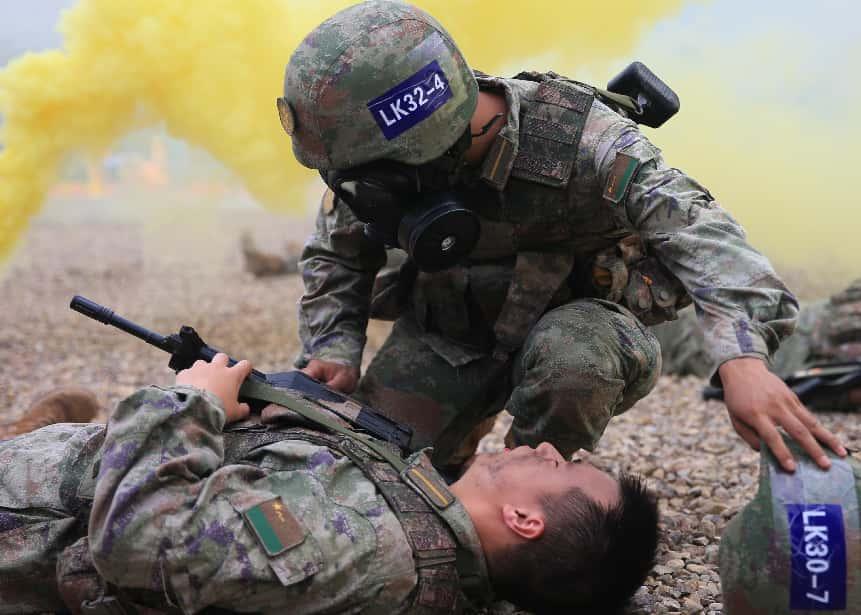 “衛(wèi)生員,這里有‘傷員’!”演練場(chǎng)上,一名佩戴紅十字袖標(biāo)、全副武裝的學(xué)員快速躍進(jìn),為“頭部受傷”的戰(zhàn)友進(jìn)行包扎,一旁“腿部中彈”的“傷員”依托掩體展開(kāi)自救……