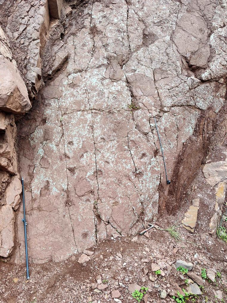 考察隊在凍多村發(fā)現(xiàn)了兩個足跡點。其中一處遺跡化石是尺寸較小、孤立的蜥腳類恐龍足跡,大小從8.8厘米到15.5厘米不等,可能由6只以上恐龍留下。