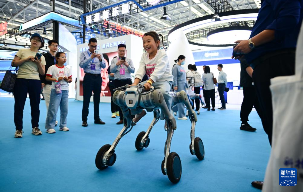 4月26日,小朋友在第三屆中國(安徽)科技創(chuàng)新成果轉(zhuǎn)化交易會上體驗(yàn)一款機(jī)器狗。