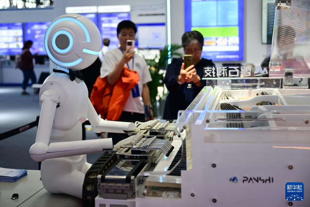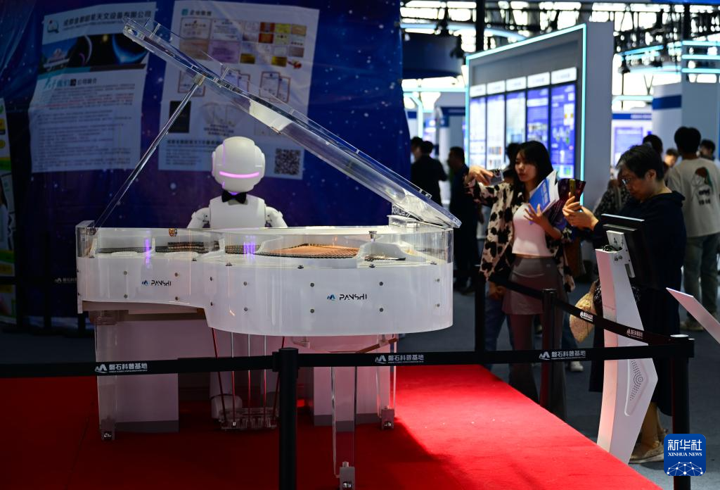 4月26日,觀眾在第三屆中國(安徽)科技創(chuàng)新成果轉(zhuǎn)化交易會上觀賞一款彈鋼琴的機(jī)器人。