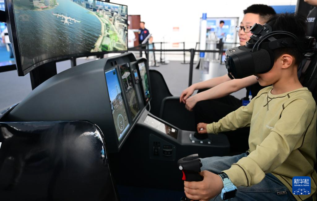 4月26日,小朋友在第三屆中國(安徽)科技創(chuàng)新成果轉(zhuǎn)化交易會上體驗(yàn)一款駕駛艙模擬器。