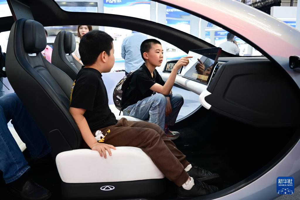 4月26日,小朋友們在第三屆中國(安徽)科技創(chuàng)新成果轉(zhuǎn)化交易會上體驗(yàn)一款智能座艙。