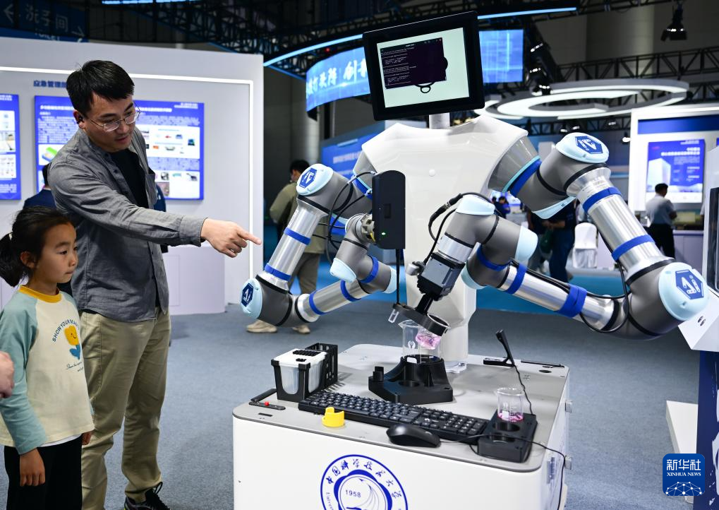 4月26日,觀眾在第三屆中國(安徽)科技創(chuàng)新成果轉(zhuǎn)化交易會上參觀一款數(shù)據(jù)驅(qū)動的全流程機(jī)器化學(xué)家。