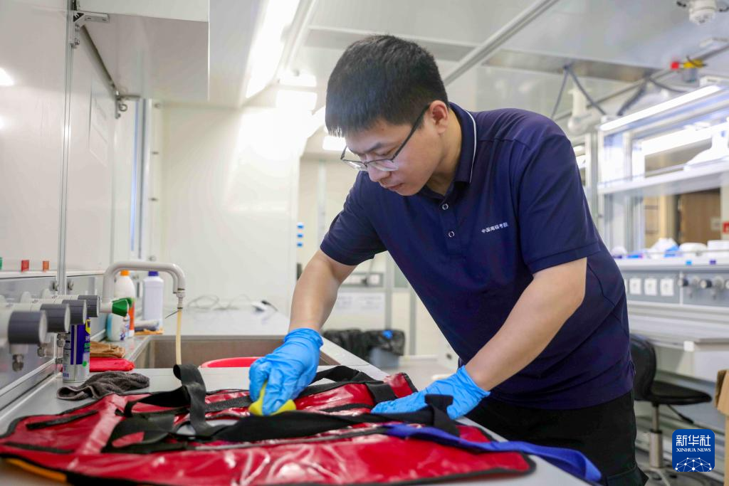 5月4日,“雪龍2”號實(shí)驗(yàn)員何靖在清潔、整理實(shí)驗(yàn)器材。
