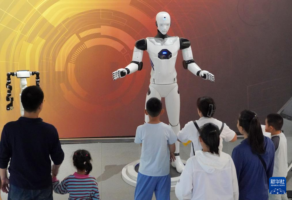 5月24日,觀眾在山東省科技館觀看人形機(jī)器人。