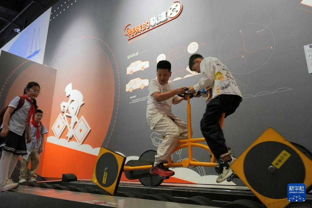 5月24日,小朋友們?cè)谏綎|省科技館體驗(yàn)方形車(chē)輪自行車(chē)。