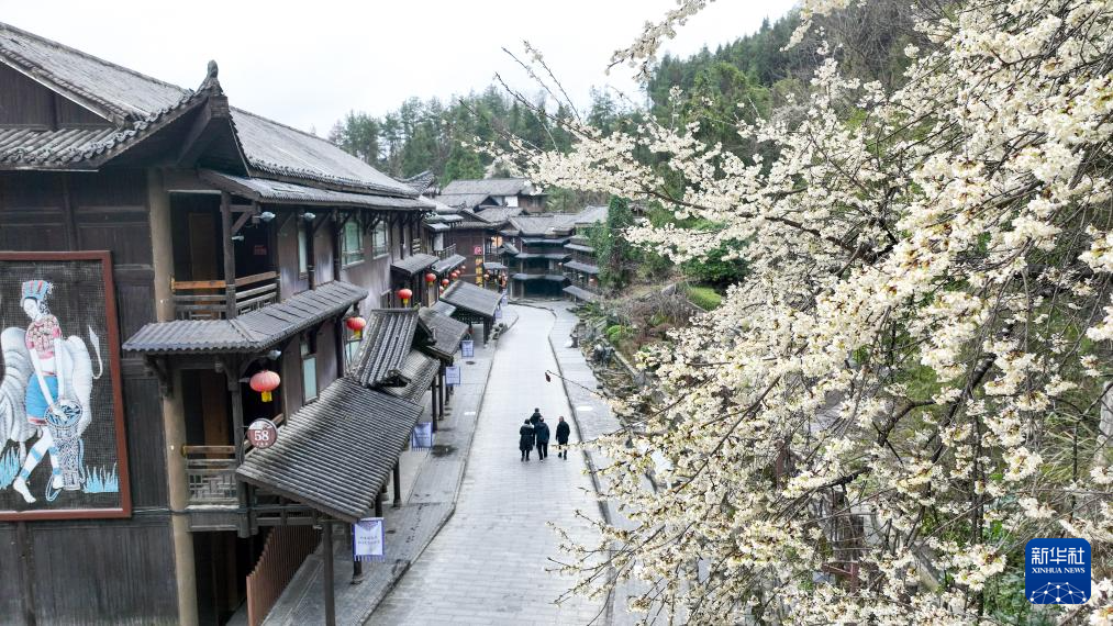 3月4日拍攝的櫻花掩映的重慶市酉陽(yáng)土家族苗族自治縣酉州古城(無(wú)人機(jī)照片)。
