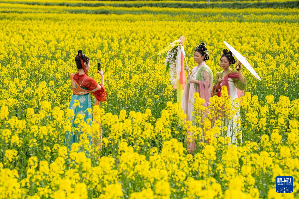 3月4日,游客在四川省廣安市廣安區(qū)花橋鎮(zhèn)花橋村油菜花田拍照留影。