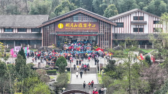 2025年3月12日,航拍下的江西省宜春市明月山溫泉風景名勝區(qū),大批游客云集在游客中心,有序進入景區(qū),登高一覽有著“絕壁驚人,怪石爭奇,蒼松斗妍,山花織錦,云霧繚繞”五絕之稱的明月山奇觀。