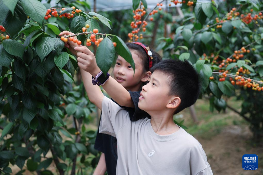 4月20日,在同山鎮(zhèn)三新村的櫻桃種植大棚內(nèi),小朋友在采摘櫻桃。