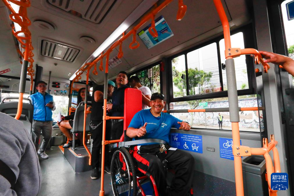3月31日,在厄瓜多爾首都基多,市民體驗宇通雙源無軌電車。