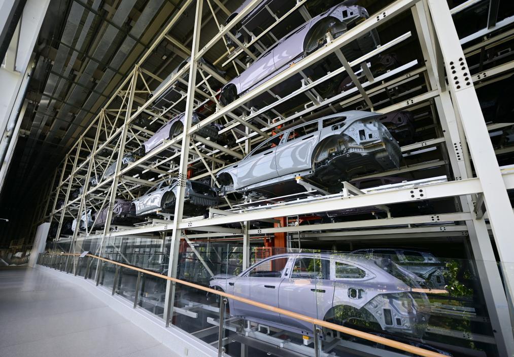 這是蔚來先進(jìn)制造新橋二工廠內(nèi)的“魔方”車輛存取平臺(tái)。新華社記者 周牧 攝