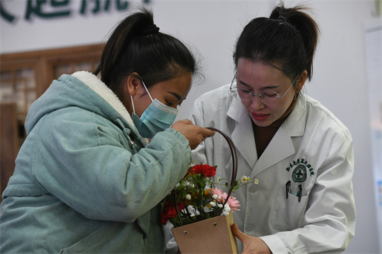 2025年3月6日,醫(yī)護(hù)人員在位于貴州省凱里市的黔東南康復(fù)民族醫(yī)院給患者贈(zèng)送鮮花,慶“三八”節(jié)。(楊仁海 攝),