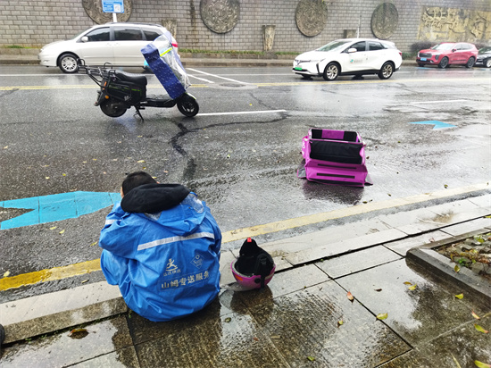 昨日(3月13日)上午,天下著雨,在長沙長星路與緯十二路交界路口,一名受傷的外賣小哥坐在冰冷的人行道邊,正在苦等旁邊一輛寶馬3系的車主。