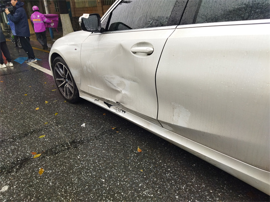 原來,當(dāng)天上午9時(shí)許,這名外賣小哥騎著電動車行駛到上述路口時(shí),正好碰見對向的一輛網(wǎng)約車司機(jī)左轉(zhuǎn)彎,由于天雨路滑,剎車來不及,為緊急避險(xiǎn),外賣小哥慌亂中撞向了旁邊停放的一輛寶馬3系車,于是出現(xiàn)了上述一幕!