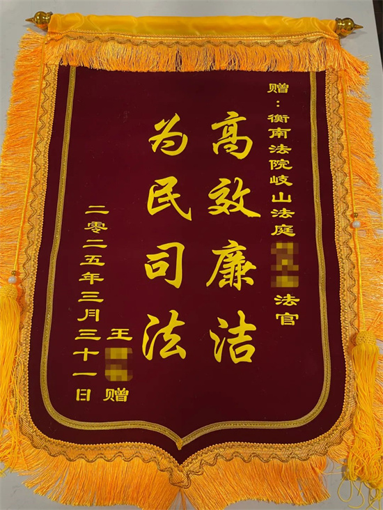 “你好!你有一個包裹,請查收!”近日,衡南法院岐山法庭工作人員收到一個五百公里之外寄來的“神秘”長條形狀的包裹。“王某的案子不是已經執(zhí)行完畢了嗎,這寄的會是什么呢?”法庭工作人員簽收時還很納悶,打開一層層用心的包裝,里面竟是一面紅彤彤的錦旗。“高效廉潔,為民司法”,金燦燦的贊語正是王某最誠摯、最樸實的心聲,表達著自己對衡南法院工作的高度認可。