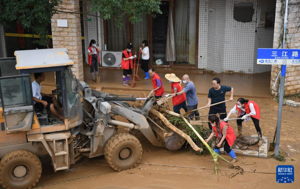6月19日,志愿者在廣東省肇慶市懷集縣城的三江路清理雜物。