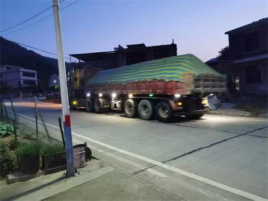 S236公路上滿載砂石的拖掛車超高超載不時(shí)有砂石撒落
