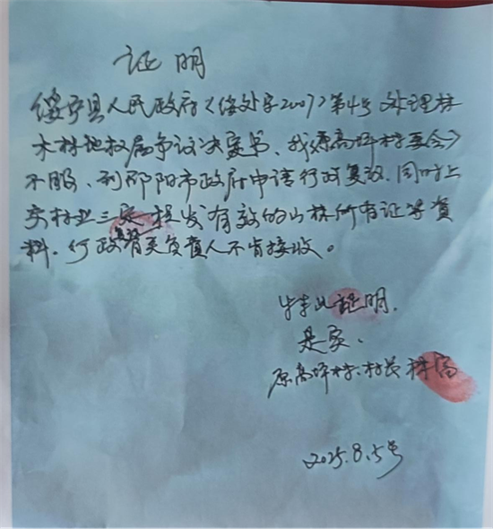 周順馮說(shuō),綏寧縣山糾辦工作人員隨意性很大,在高坪村已經(jīng)有林權(quán)證的情況下,依然受理茶江村的申請(qǐng),原高坪村的桐子沖、看牛坪兩處林木林地,有”林業(yè)三定“時(shí)縣政府依法核發(fā)的山林所有證,縣委檔案館、縣林業(yè)局檔案室都有存檔,歷史以來(lái)沒(méi)有糾紛。