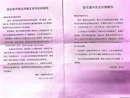 回到家里以后,深受感動的周女士特意定制了一面錦旗寄至黃龍洞景區(qū)。她在給毛建華的感謝信中寫道:“您的善舉,就像張家界的山水一樣動人……這一份無私與勇敢,值得我們永遠(yuǎn)學(xué)習(xí)與銘記。”同時,周女士還致信黃龍洞景區(qū)領(lǐng)導(dǎo),對景區(qū)能夠培養(yǎng)出如此優(yōu)秀的員工致以敬意, 她說:“毛建華先生的舉動,既是他個人品德的體現(xiàn),更彰顯了景區(qū)優(yōu)質(zhì)的員工培養(yǎng)體系與深厚的服務(wù)底蘊(yùn)。”