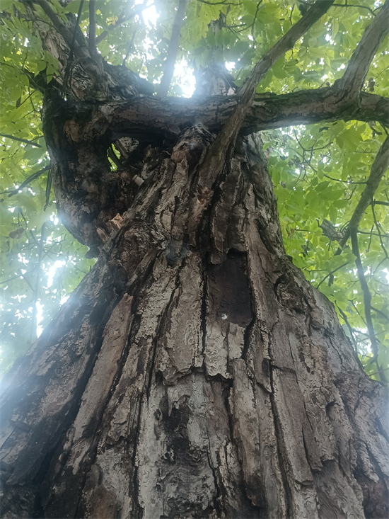 這棵古核桃樹,兩個(gè)人用雙手都不能合圍,樹高看上去要超過50米,樹冠覆蓋面積在三畝以上,核桃成熟的時(shí)候,早些年,可供近二十人同時(shí)上樹摘核桃。