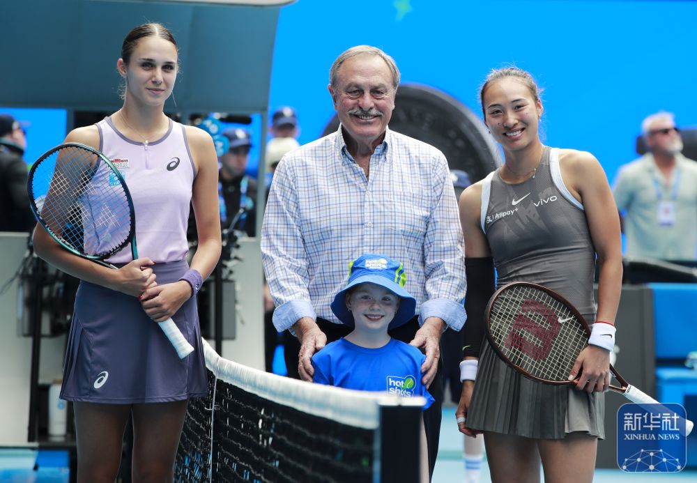 鄭欽文(右)、托多尼(左)在比賽前與澳大利亞網(wǎng)球名將約翰·紐康姆合影。新華社記者 馬平 攝