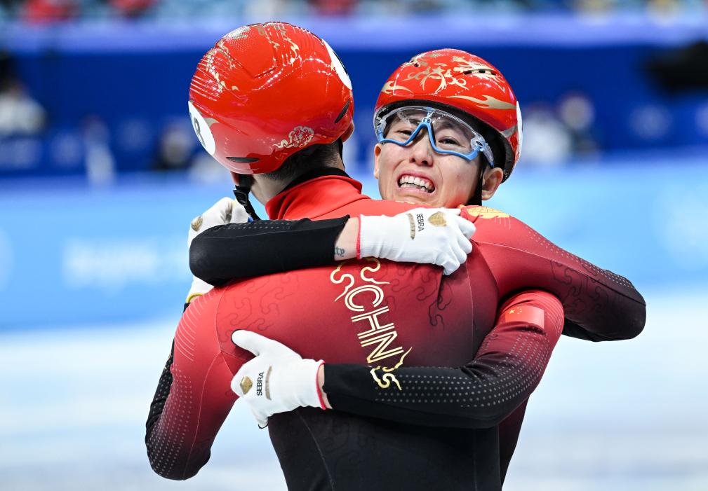 2022年2月5日,范可新(右)在北京冬奧會短道速滑男女混合接力決賽后慶祝。
