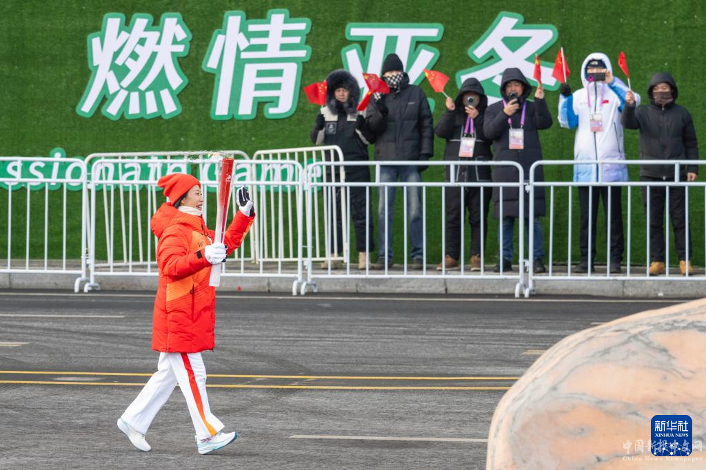 2月3日,第一棒火炬手申雪在傳遞火炬。