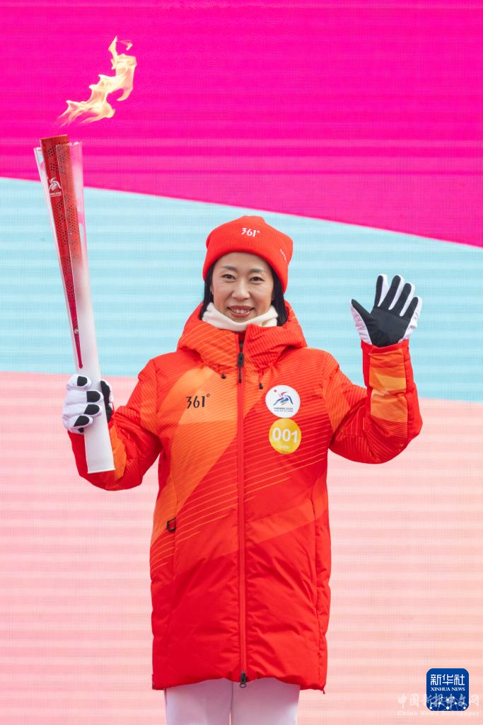 2月3日,第一棒火炬手、奧運(yùn)冠軍申雪在傳遞火炬。