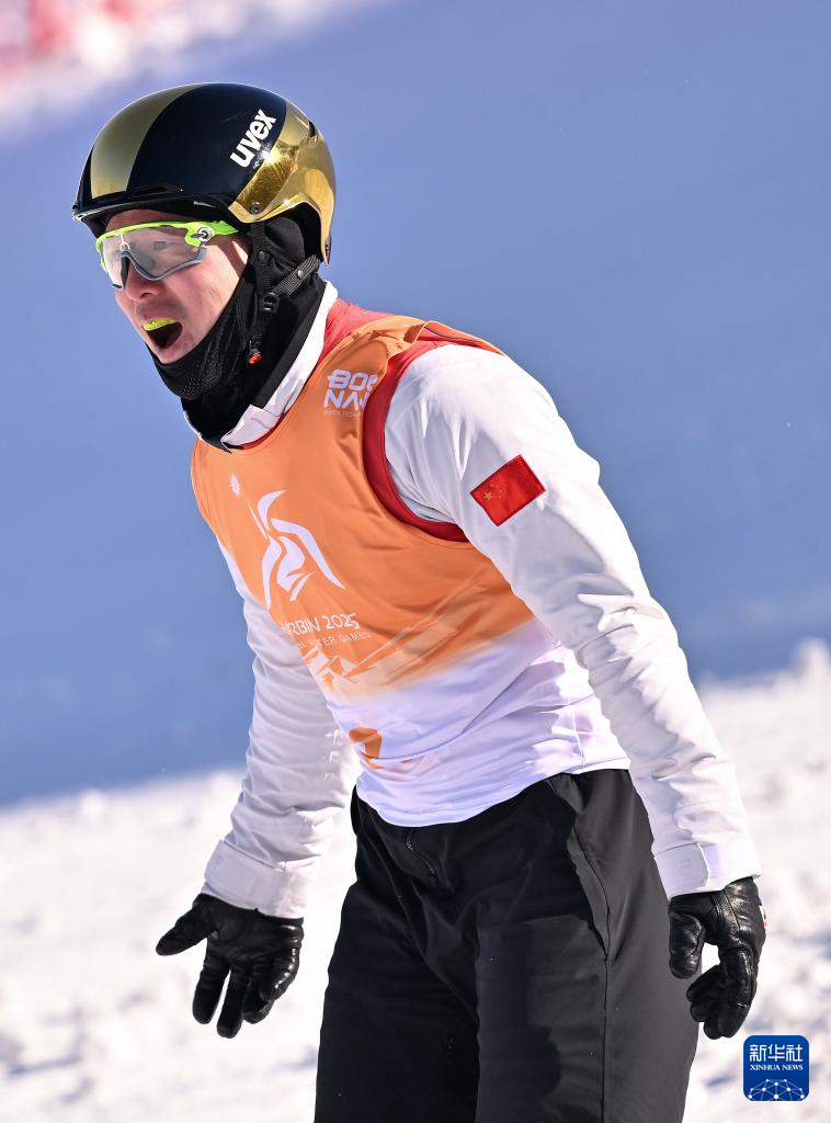 2月10日,中國隊選手齊廣璞在決賽中完成動作后慶祝。