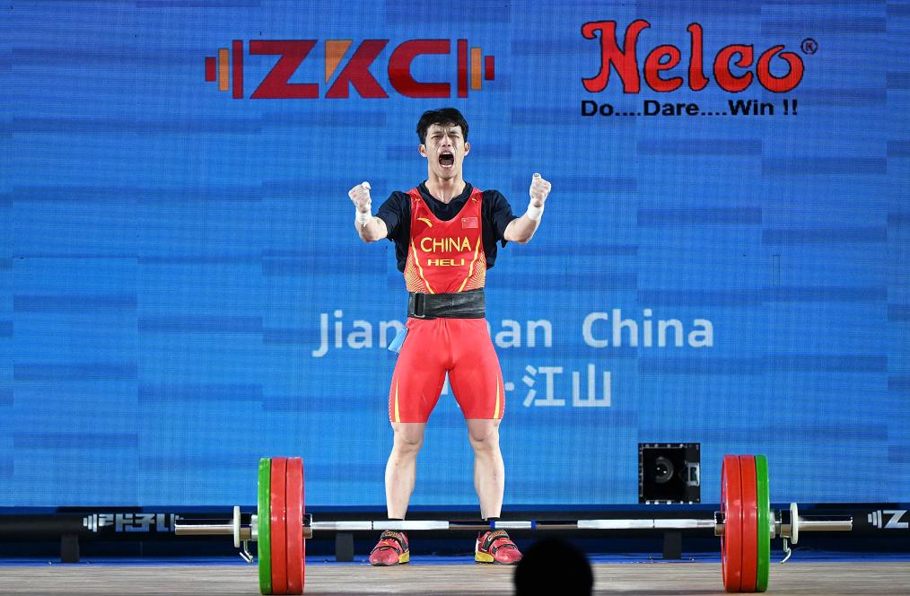 5月9日,中國(guó)選手王威東在比賽中慶祝試舉成功。新華社記者 侯昭康 攝